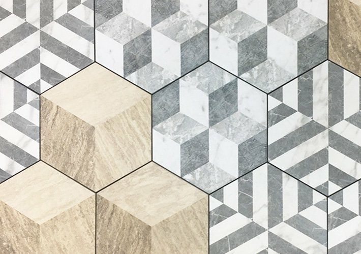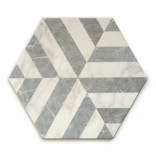 大理石調のデティールを面状に、異なる色味を組み合わせてデザインにおこした、イタリア生まれの六角形タイルです。シルクのような質感と滑らかさで、ユニークな形状ながらも上質な印象を持ち合わせています。