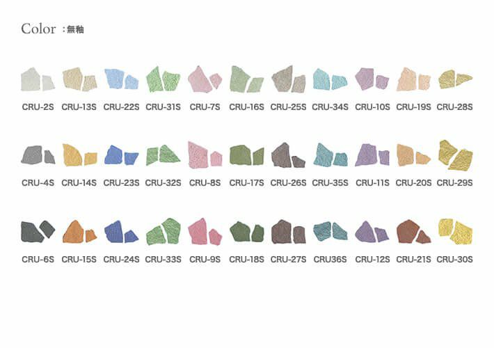 製造工程で割った特殊形状のタイルです。ふたつとして同じ形のないクラッシュタイルは曲面表現・オブジェ創作など造形感覚を刺激する「タイルアート素材」。鋭角部分の縁も丸く施工しているので安全です。DIYや工作などに!