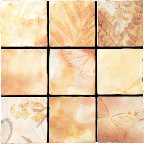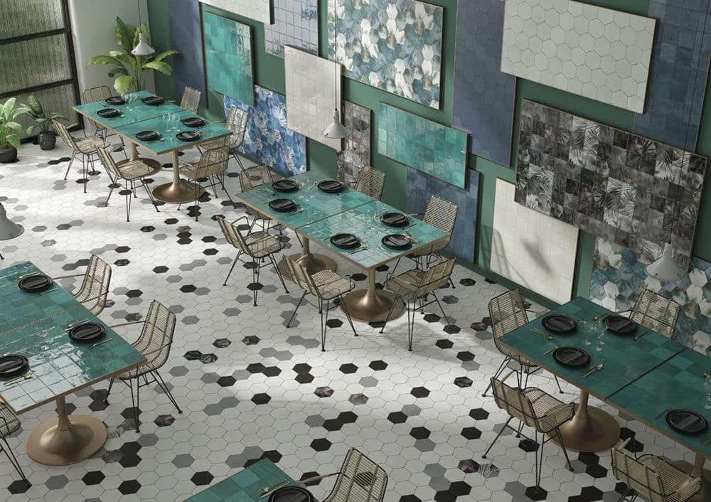 モロッコの伝統的なゼリージュ・タイルをモチーフに、流行のボタニカル柄と六角形を加えて現代的な使い方をしています。
