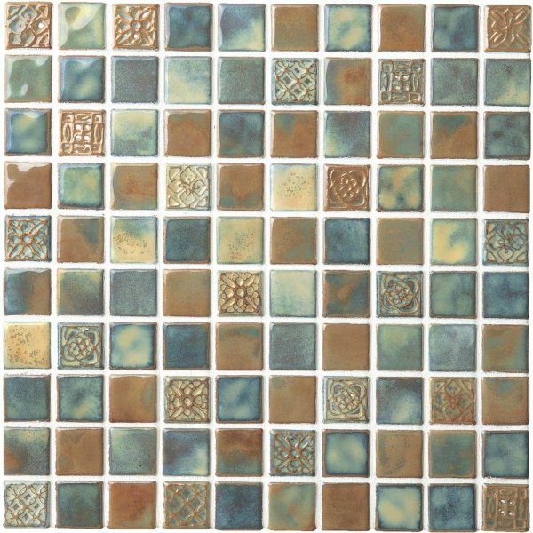 窯変釉と波打つテクスチュアが創り出す、ふんわりとした色彩の揺らぎ。クラシカルな彫刻柄をミックスしたモザイクタイルです。