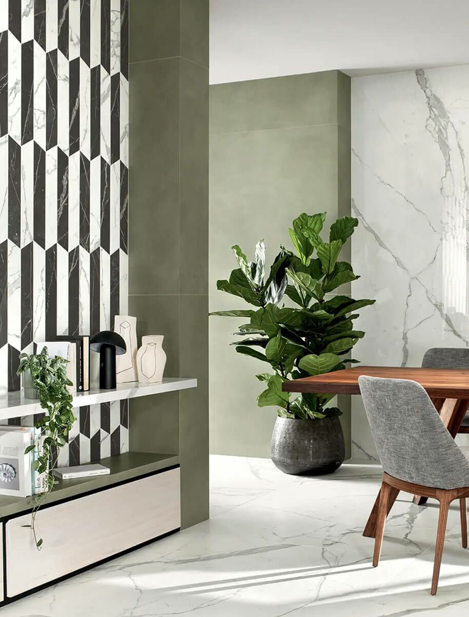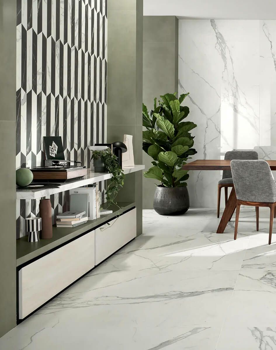 カララやアプアン・アルプスなど、大理石の魅力にインスパイアされたコレクションです。ギリシャやローマなど古代宮殿の優雅な装飾を取り入れ、現代的な感覚と最新の技術で再解釈・再構築しています。躍動感を演出する六角形や平行四辺形の形状も、特徴として際立つマテリアルです。