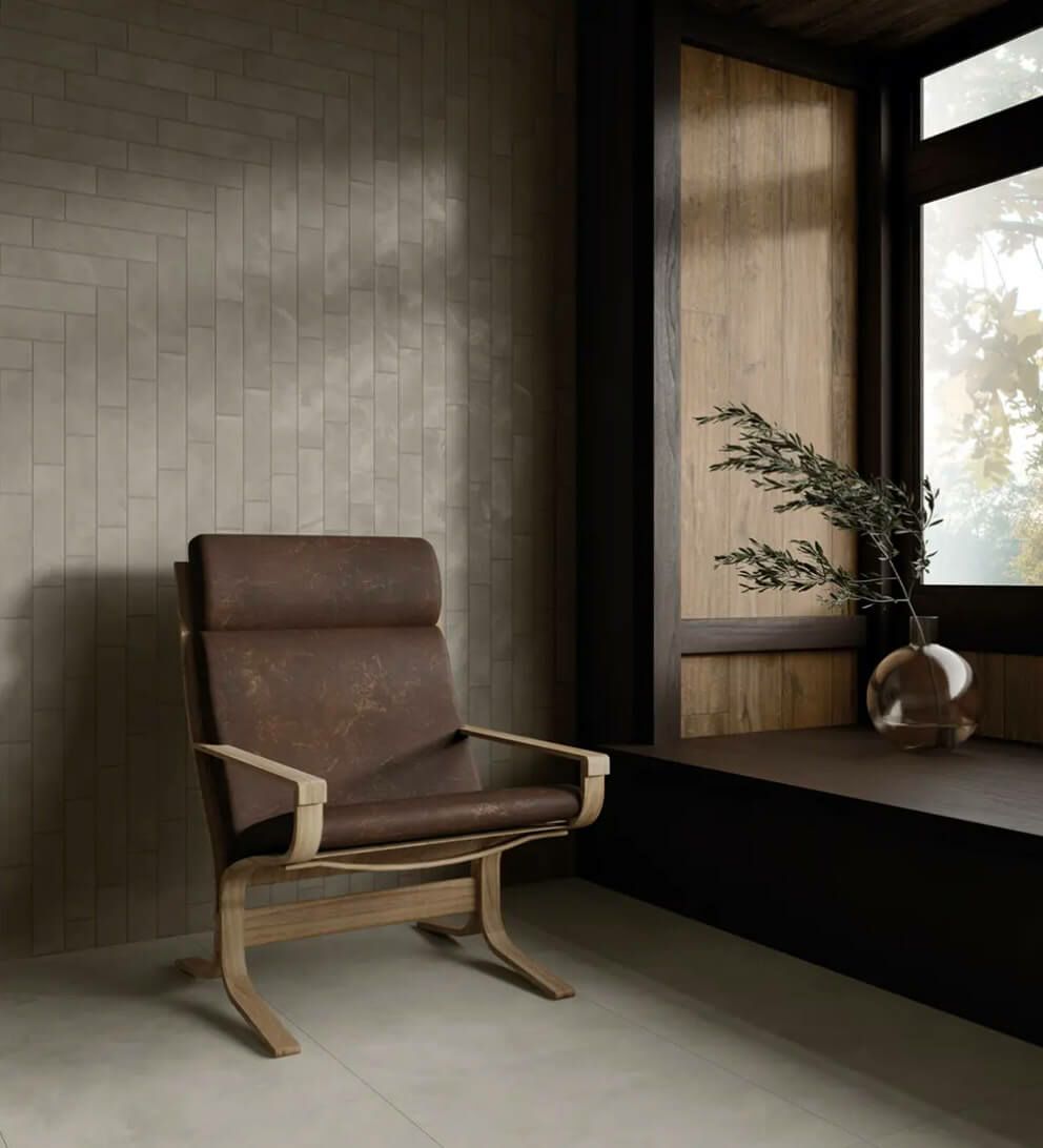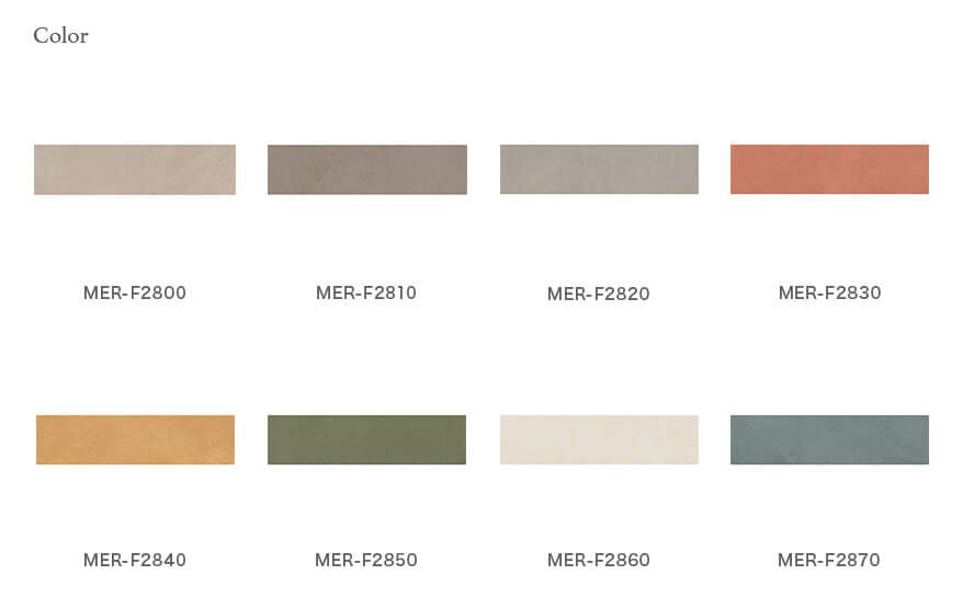 壁と床どちらにも使用できるセメント調のタイルを、近年人気の高い少しスモーキーなニュアンスカラーで表現しています。複数の色彩とさまざまな張りパターンを組み合わせることで、快活で明るい表情の空間演出を可能にします。