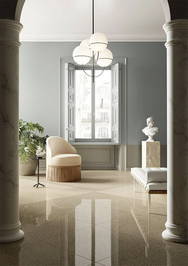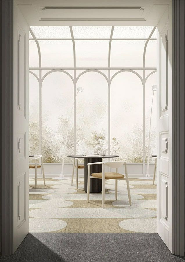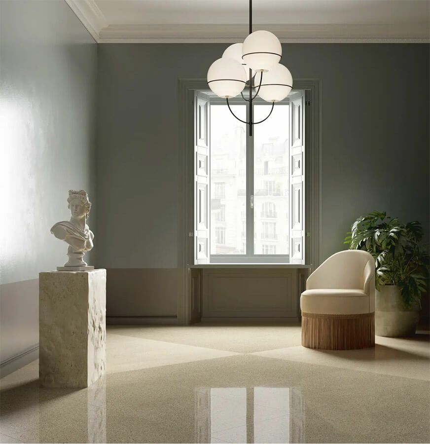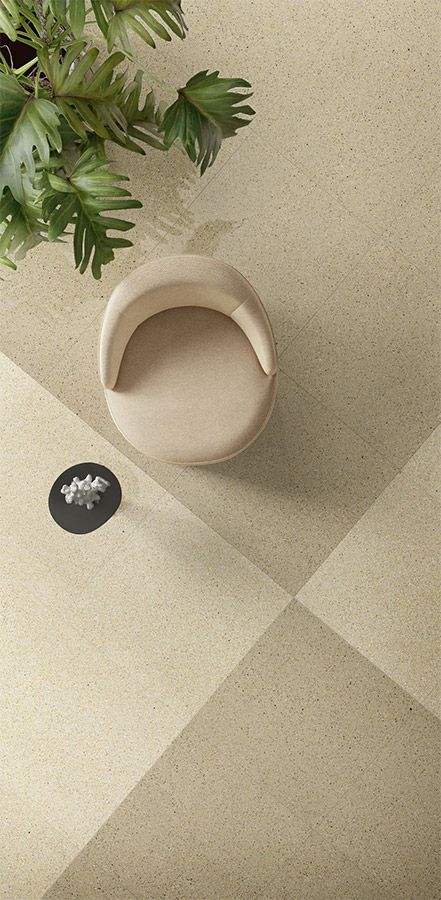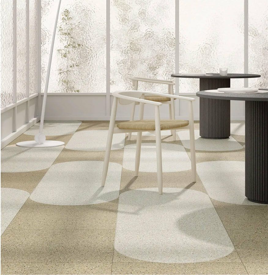 素地の中まで模様が入り込む、トレンドのフルボディ製法でよりリアルなテラゾータイルを再現しました。ブライト・マットの2面状を張り合わせて、洗練されたスタイリッシュな空間を楽しめます。
