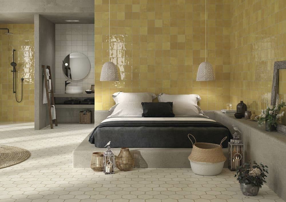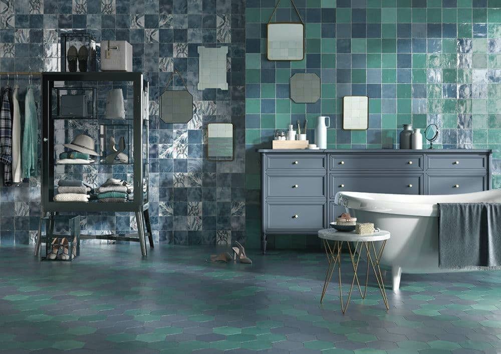 モロッコの伝統的なゼリージュ・タイルをモチーフに、流行のボタニカル柄と六角形を加えて現代的な使い方をしています。