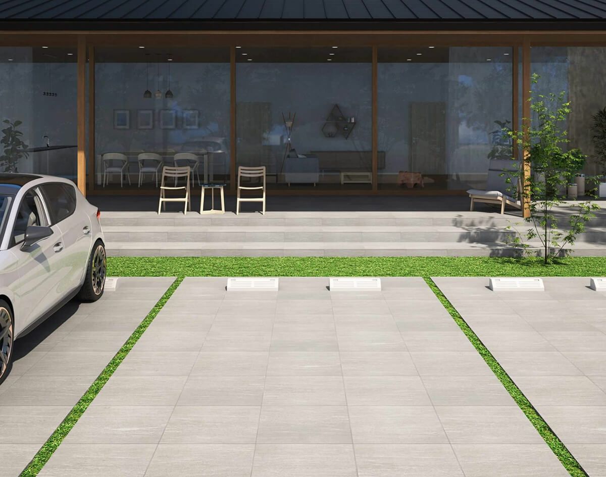 全国のハウスメーカー、ビルダーに標準採用頂いている玄関ポーチ用大判タイルを18mm厚のエクステリア用にリリースしました。 建物内部から玄関、アプローチや駐車場等外構まで、トータルでコーディネート可能です。