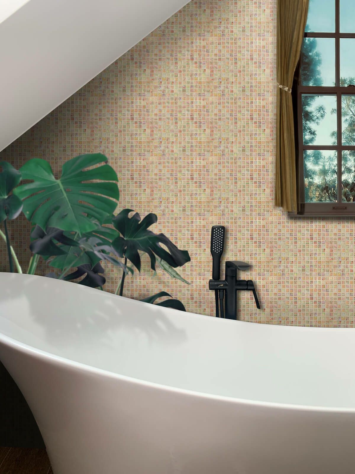 ステンドグラスのようなガラスタイル。光の反射を受けてより美しく輝きます。
