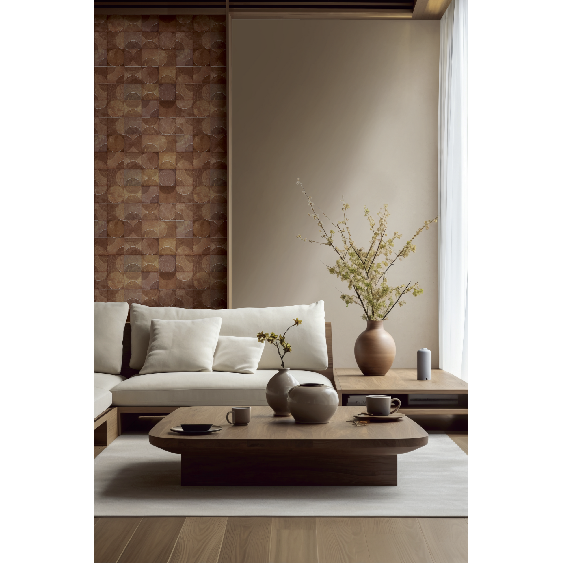 意図的に仕込まれた“予測不能な組み合わせ”。幾何学と渦模様の重なりはランダムに変化し、すべての設置が唯一無二の仕上がりに。反復や均一性から解放されたこの美しさは、個性的で記憶に残る壁づくりに最適です。1枚の中でサテンと光沢の質感が交錯し、光の角度や視点によって常に異なる表情を見せるウォールタイルです。