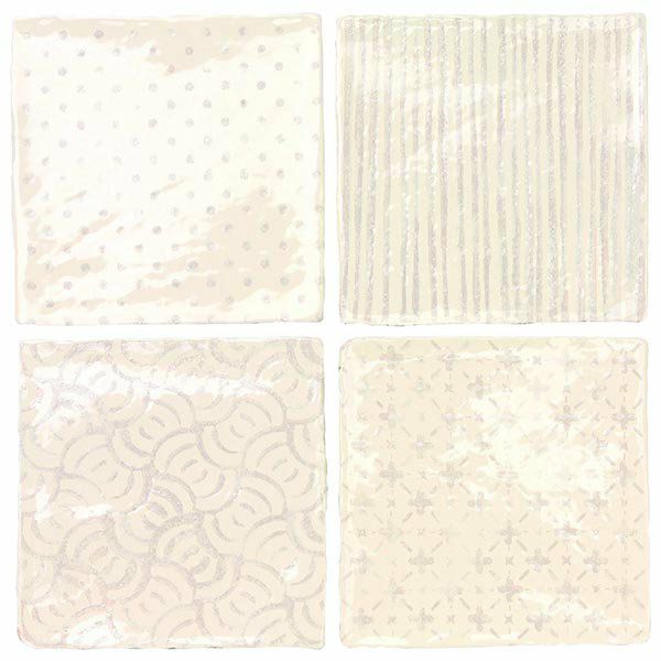 スペインの伝統的な製法で丁寧に仕上げられた釉薬の美しいクラフト調タイル。手仕事による波打つ面状が特徴で、柄物はうっすらとさりげないアクセントに。