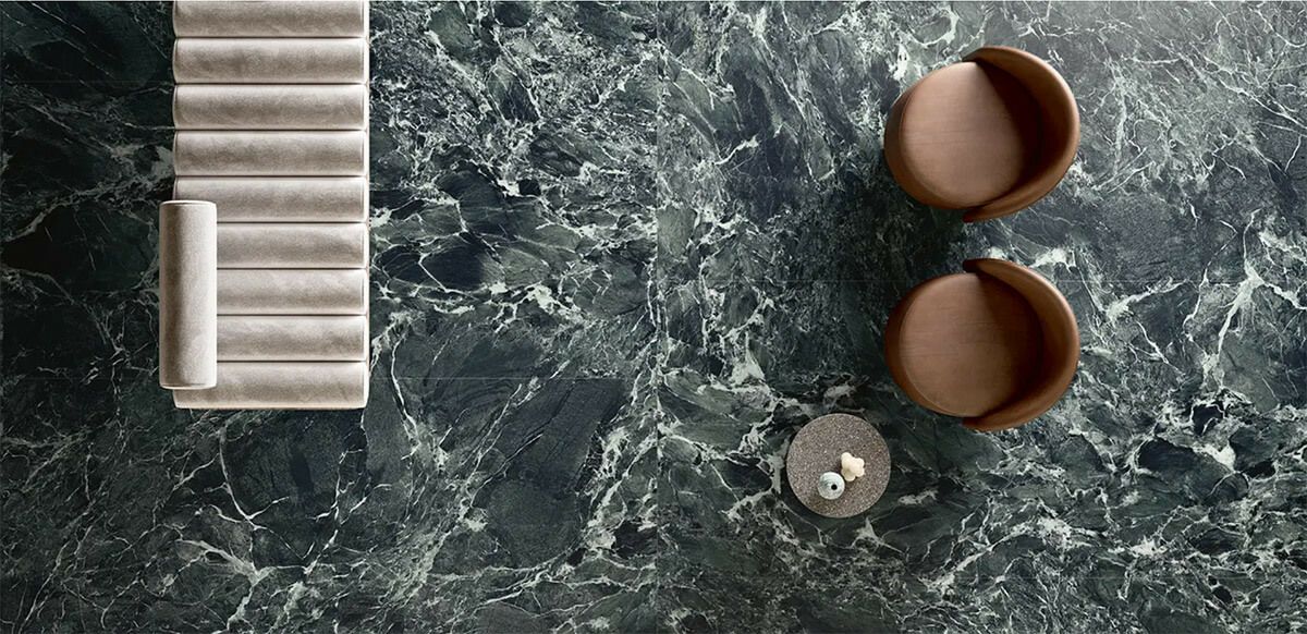 大理石調タイルの最高峰シリーズ、マルミマキシマム。 複雑な石模様や透明感を表現するため、原料となるパウダー状の粘土を複数色配合。 さらに釉薬を素地の中まで浸透させた状態で高温焼成し、本物のような美しさと、本物以上の物性を兼ね備えた製品を実現しました。
