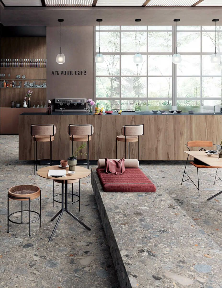 北イタリアで採掘される天然石、「Ceppo di Gr(チェッポ・ディ・グレ)」を再現した独創的なプロダクトで、現代的な要素として注目度の高いマテリアルです。 ノルディックモダンなテイスト、大胆な斑点がつくるランダム模様が、立体的な視覚効果を演出します。
