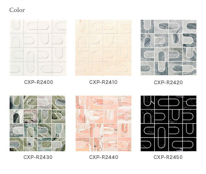 幾何学的なパターンをデザインした大理石モザイクのシリーズです。希少な大理石の持つ美しい色合いと独特な石模様が、ユニークなパターンと融合し、アール・デコ様式の美学を再現しています。特別なデザインが、クラシックで洗練された雰囲気を演出します。