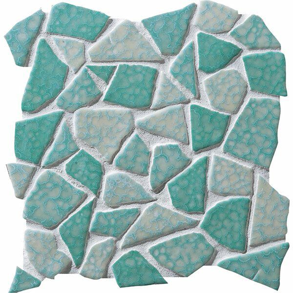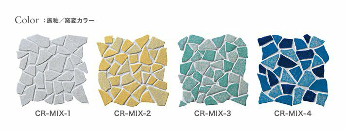 製造工程で割った特殊形状のタイルです。ふたつとして同じ形のないクラッシュタイルは曲面表現・オブジェ創作など造形感覚を刺激する「タイルアート素材」。鋭角部分の縁も丸く施工しているので安全です。DIYや工作などに!