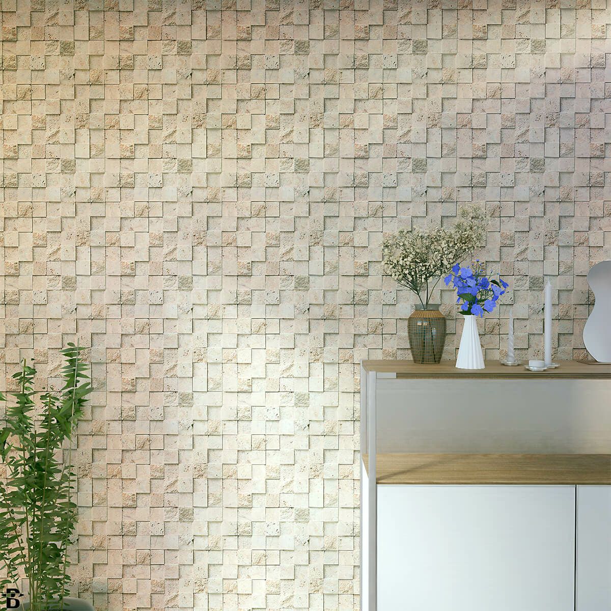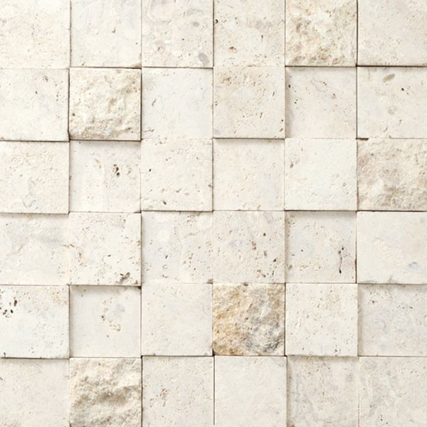 天然のサンゴが化石化して形成された天然石灰岩のモザイクタイルです。フラット面と割肌面、さらに異なる種類の厚さをミックスしたテクスチュアは、柔らかく・重厚な壁面を演出できます。ナチュラルなイメージを保ちながら、ライティングとの演出により表情の変化を楽しめます。