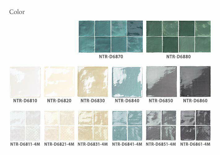 スペインの伝統的な製法で丁寧に仕上げられた釉薬の美しいクラフト調タイル。手仕事による波打つ面状が特徴で、柄物はうっすらとさりげないアクセントに。