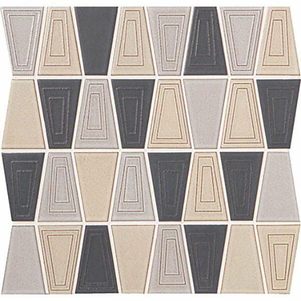 「リトム」。アールデコの幾何学デザインに触発された台形のモザイクタイル。淡く浮き出るラインの意匠が特徴的です。