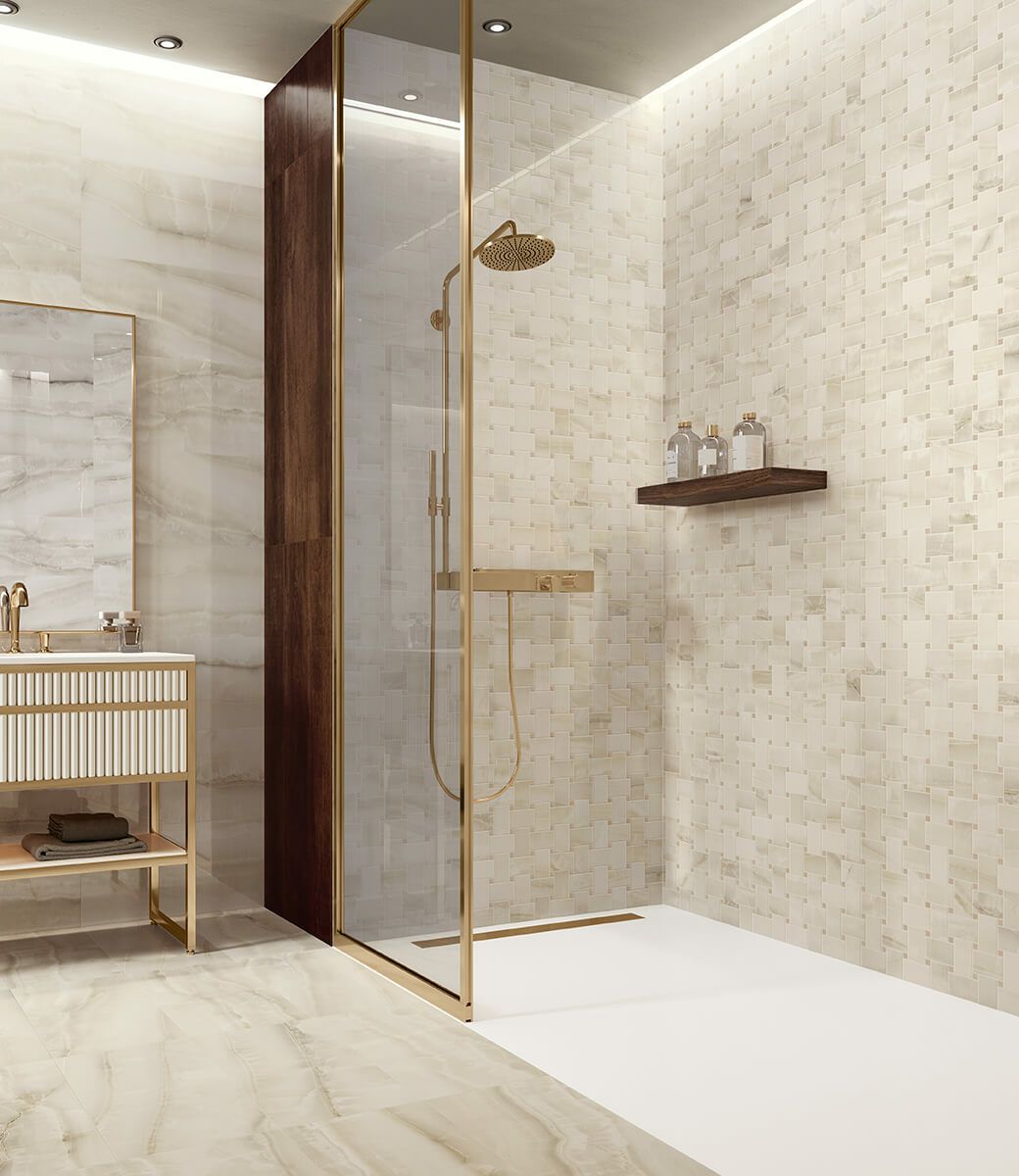 東洋の美しい海で育まれたアコヤ真珠からインスパイアされて作られたタイルです。高級なアラバスター鉱石やオニキスを連想させる特別な輝きがタイルに宿っています。特に明るい色調は、深い立体感が際立っており、これは繊細なニュアンスを巧みに取り入れ、デザインと石本来の模様を絶妙に組み合わせることで実現しました。また、結晶化処理によって形成された鉱物を均一に配置する独自のクリスタル仕上げにより、非常に高い透明度が生み出されています。