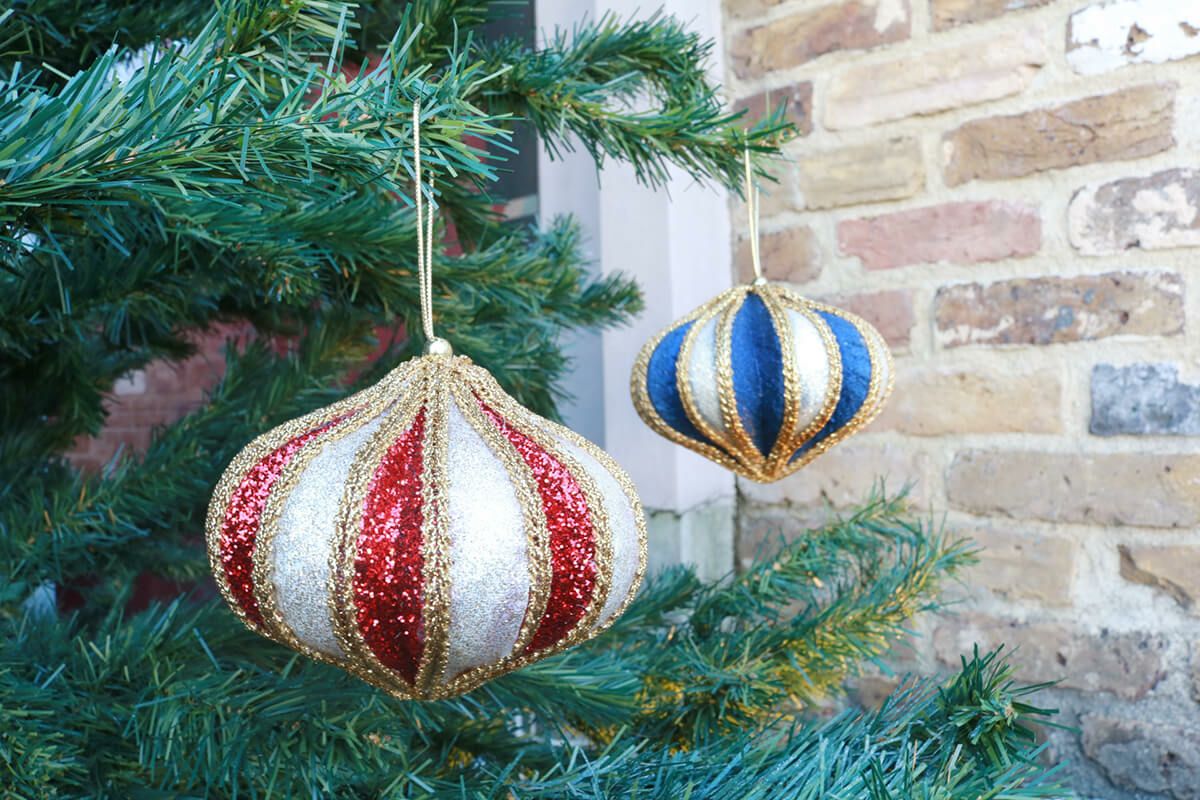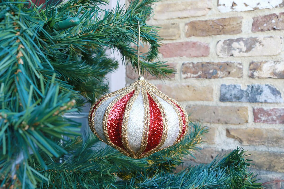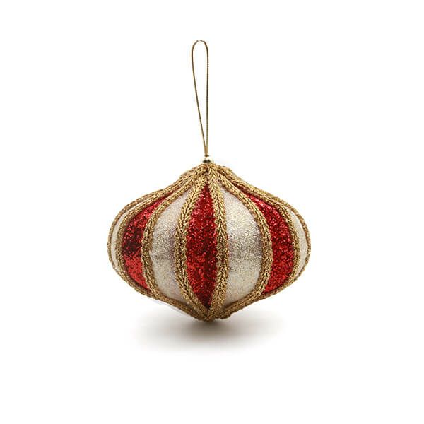 凹部分は赤の細かいスパンコールで彩られ、凸部分はシルバーをベースに重厚感のあるゴールドのリボンで縁取られています。 ボリュームのある大きさなので、ツリーに飾れば全体のイメージをぐっと底上げします。