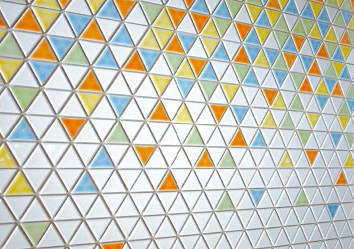 空間の新しいアクセント、トライアングル。一辺45mmのおしゃれな正三角形モザイクタイルです。万華鏡やパッチワーク感覚でオリジナルな空間造りをお楽しみいただけます。