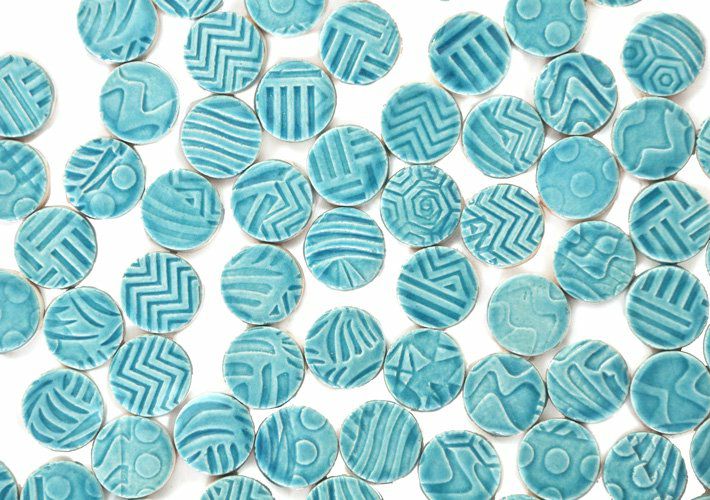 ひとつひとつ手作業でエンボス加工と彩色を施した、ターコイズ色の17mmモザイク丸タイルです。