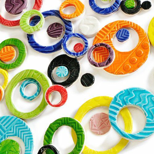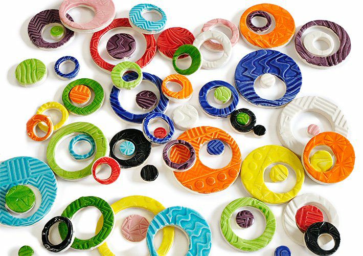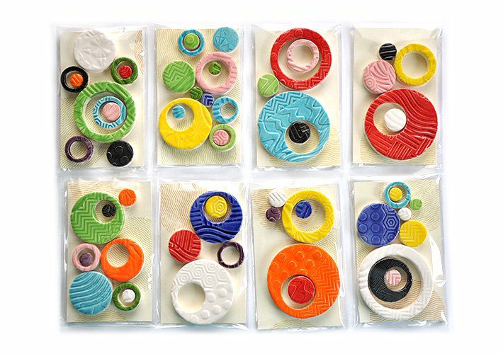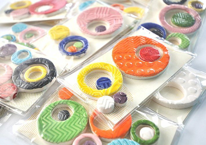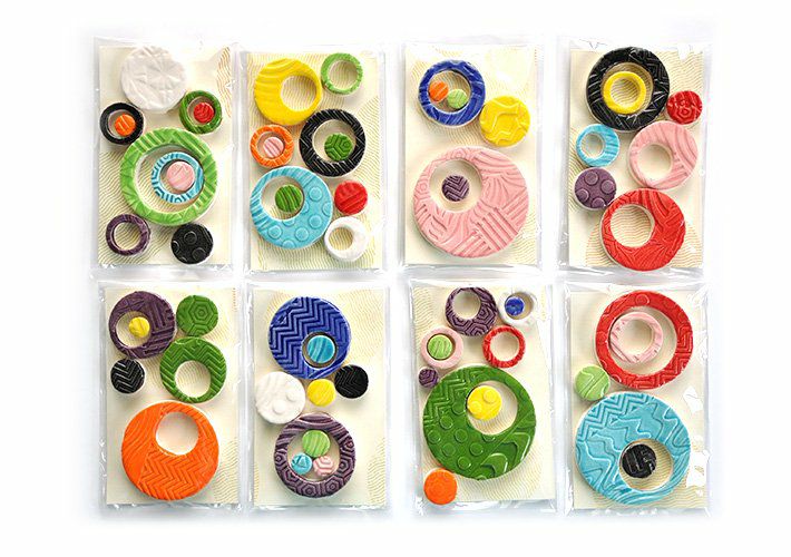 ひとつひとつ手作業でエンボス加工を施した、珍しい輪っかになった丸タイルと、大小カラフルな丸タイルの詰め合わせです。