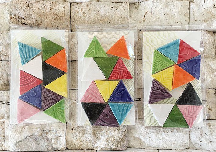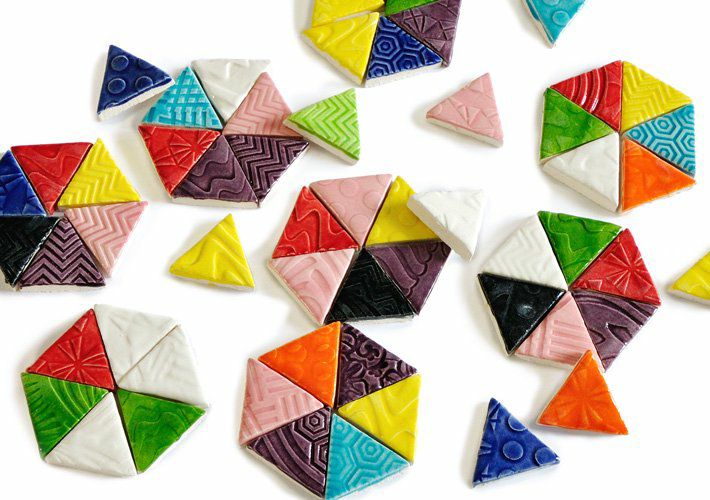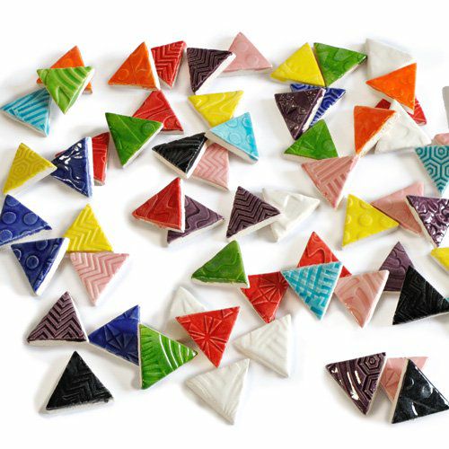ひとつひとつ手作業でエンボス加工を施した、カラフルな三角形のモザイクタイルです。