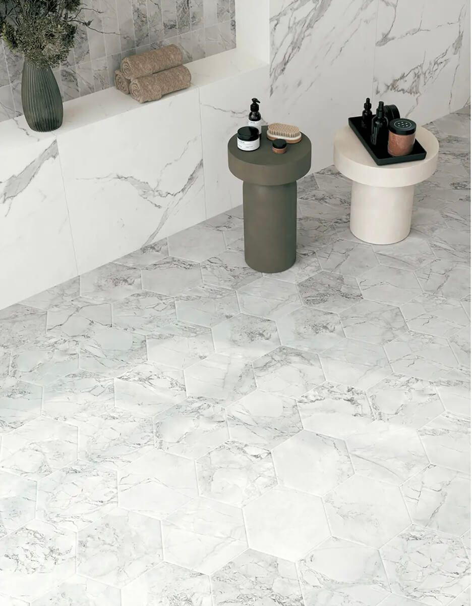 カララやアプアン・アルプスなど、大理石の魅力にインスパイアされたコレクションです。ギリシャやローマなど古代宮殿の優雅な装飾を取り入れ、現代的な感覚と最新の技術で再解釈・再構築しています。躍動感を演出する六角形や平行四辺形の形状も、特徴として際立つマテリアルです。