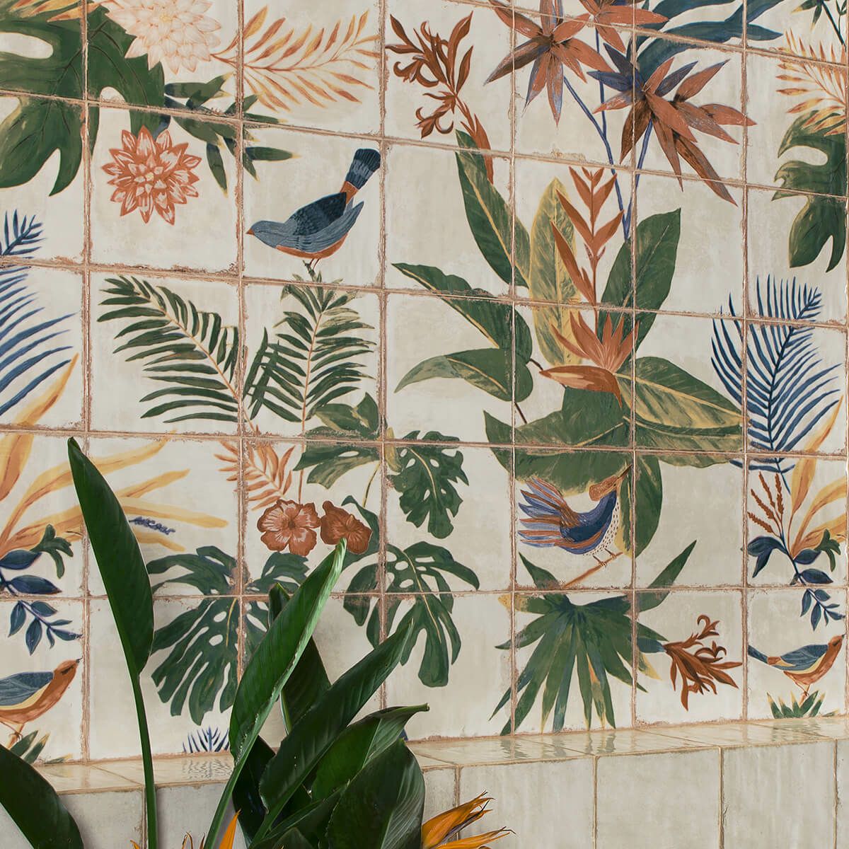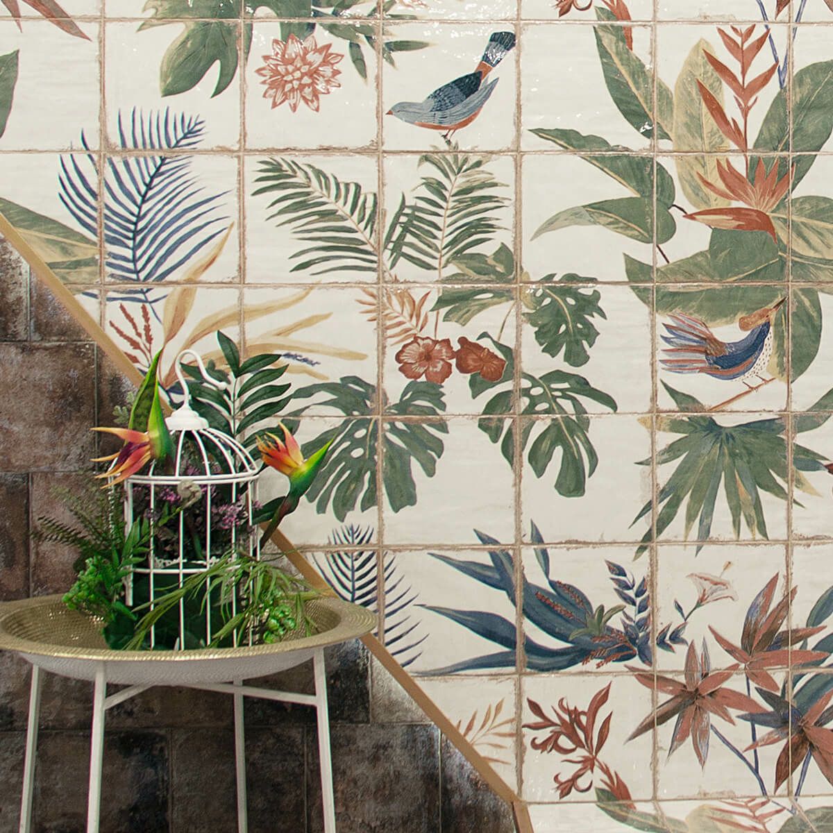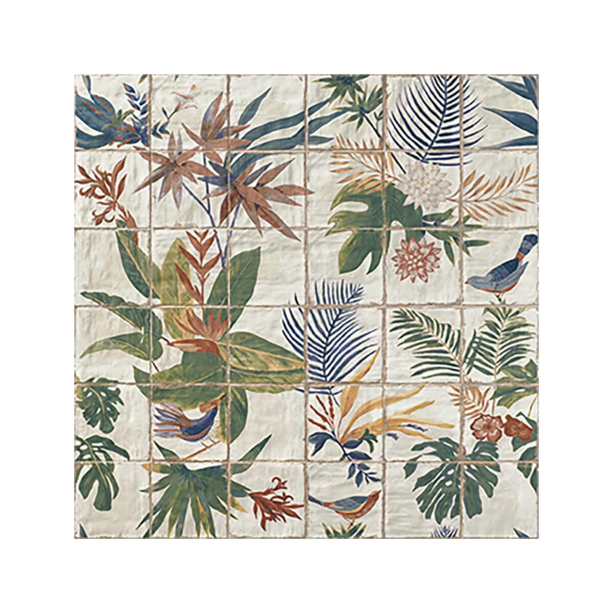 ビンテージな風合いと個性豊かなカラーとデザインのバリエーションをもつシリーズ。大胆で多彩な装飾は、MAINZUブランドの代名詞となっています。このバリエーションでは、1箱=36枚のタイルを使って1枚のアートを作り上げます。(総面積:1200×1200mm)