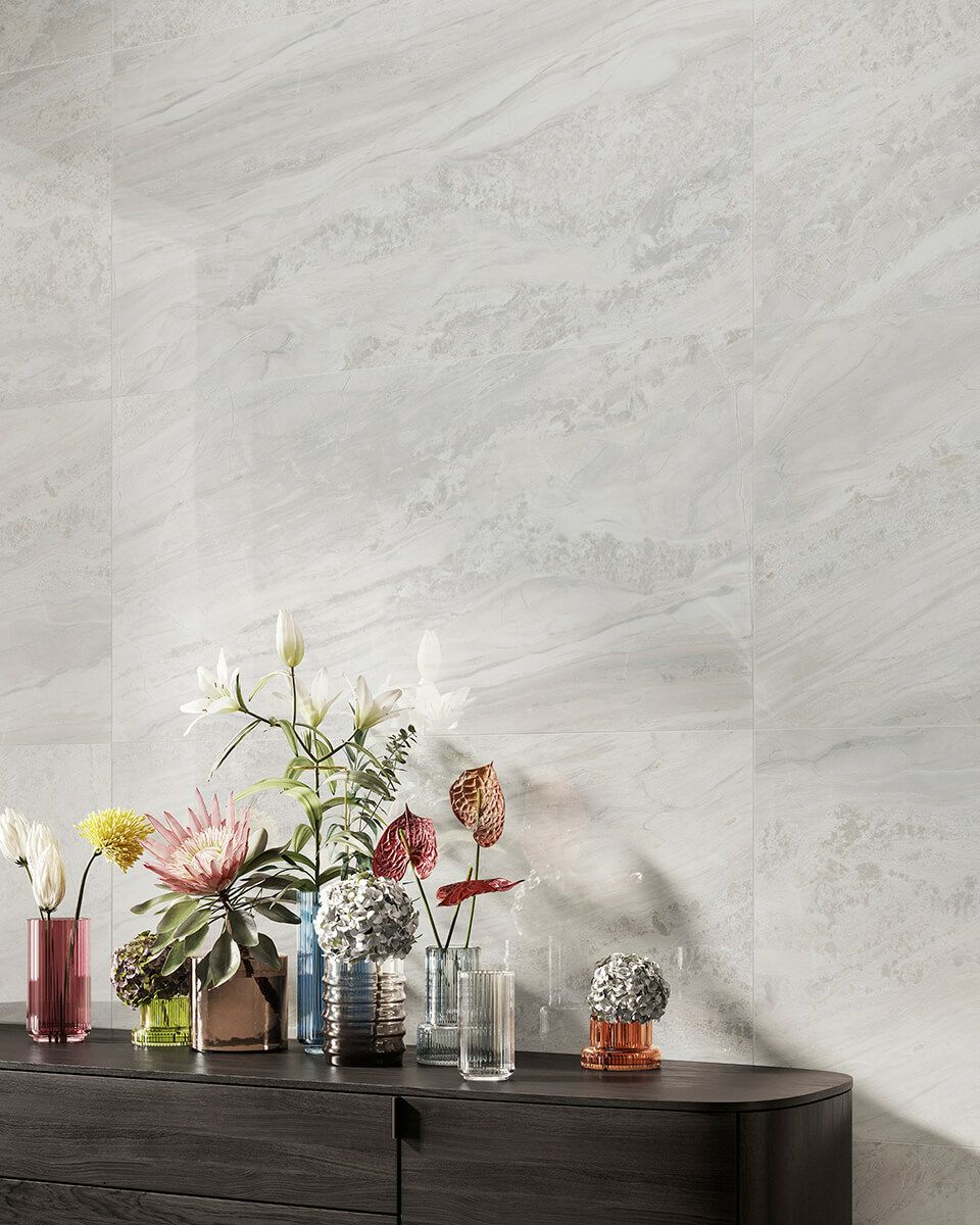 やわらかな色彩と詩的なグラフィックが空間に調和をもたらす、大理石調磁器質タイル「PARADISO」シリーズ。