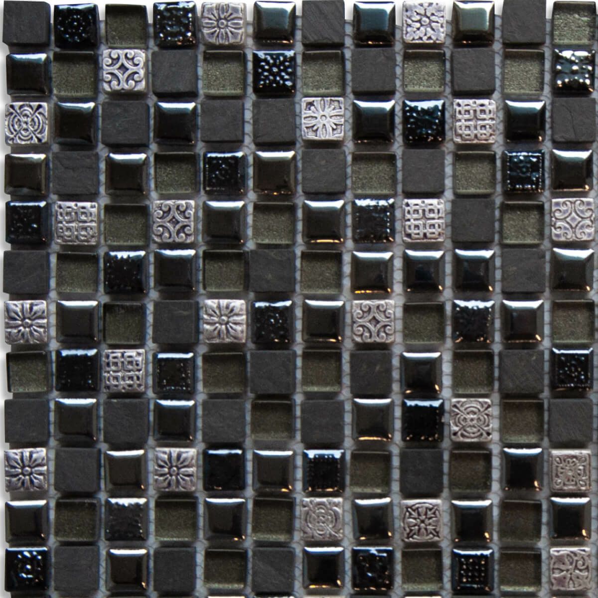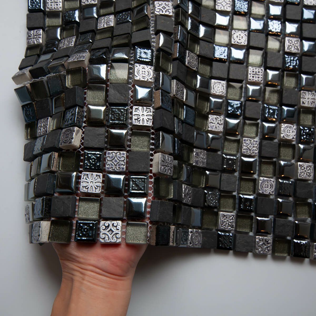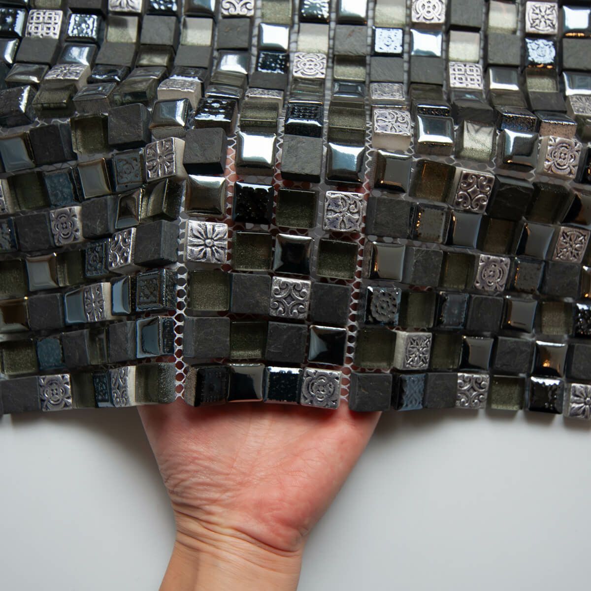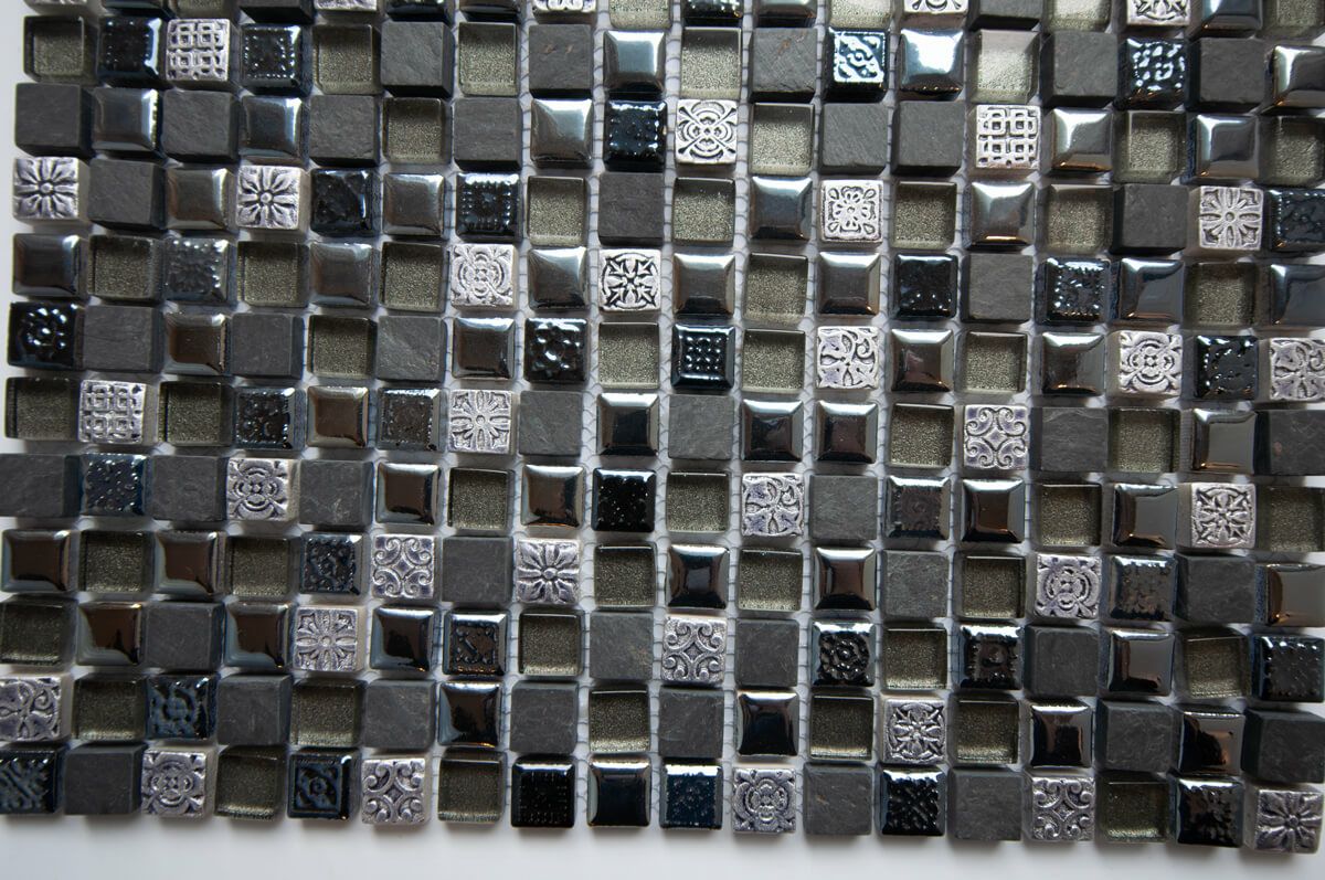 大理石やガラス、磁器などの多素材が混ざり合った美しいタイルです。