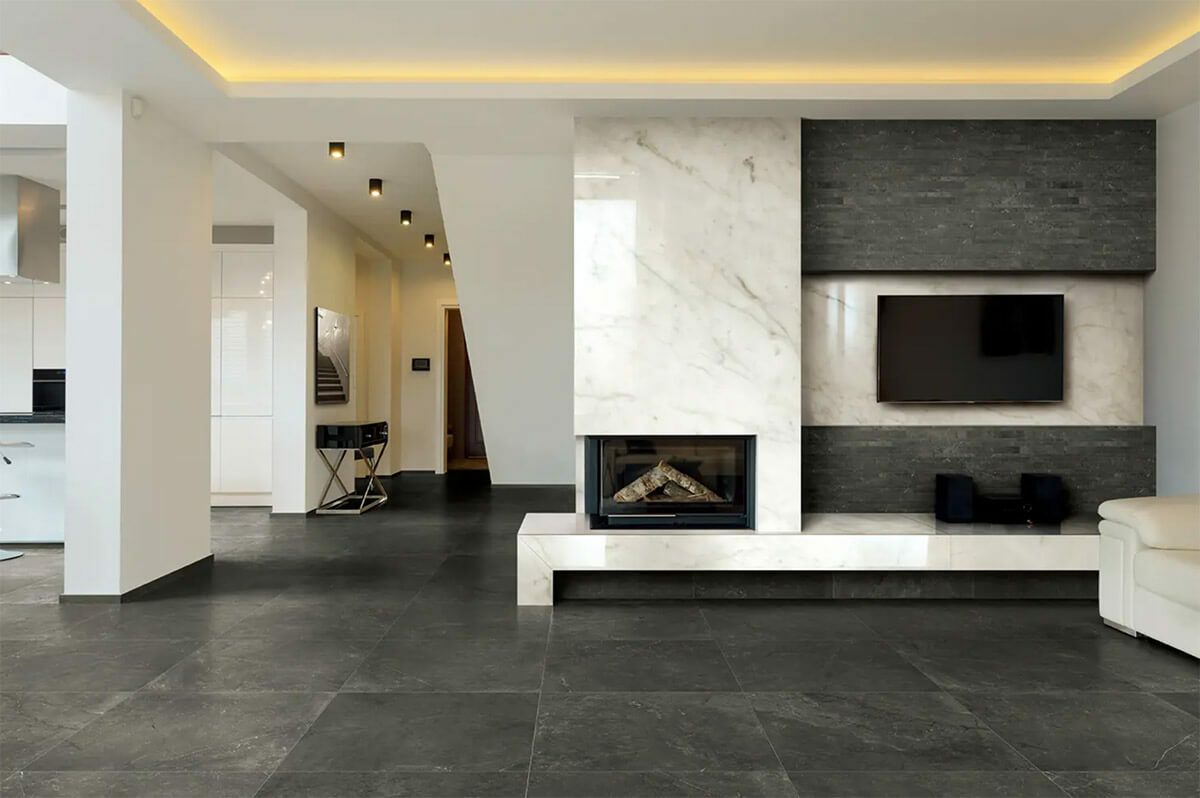 1200×600角の10mm厚で3面状を揃えた大判サイズのシリーズです。 リッジ(隆線)のように立体感のある石模様の平面と、ハンマーで叩いたような岩面、柄はカネット(糸すじ)のような繊細なラインが特徴。 厳選した5種類の天然石の再現は、ミニマルで機能的な装飾とマッチします。