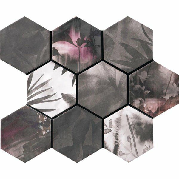 モロッコの伝統的なゼリージュ・タイルをモチーフに、流行のボタニカル柄と六角形を加えて現代的な使い方をしています。