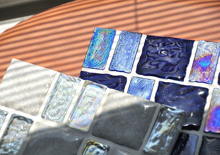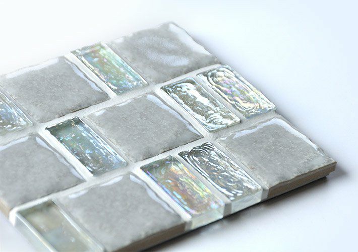長方形のガラスタイルと正方形のセラミックタイルをミックス張りした、異素材の煌びやかやかなコントラストが美しいモザイクタイルです。タイルクラフトやDIYにも使いやすい42×42角・42×20角サイズ。