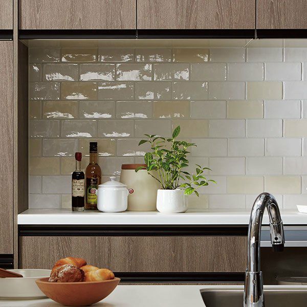 ナチュラルな素材感を感じさせる、カフェ空間にお薦めのタイルです。波打ったレリーフと透明感ある釉薬が特長です。