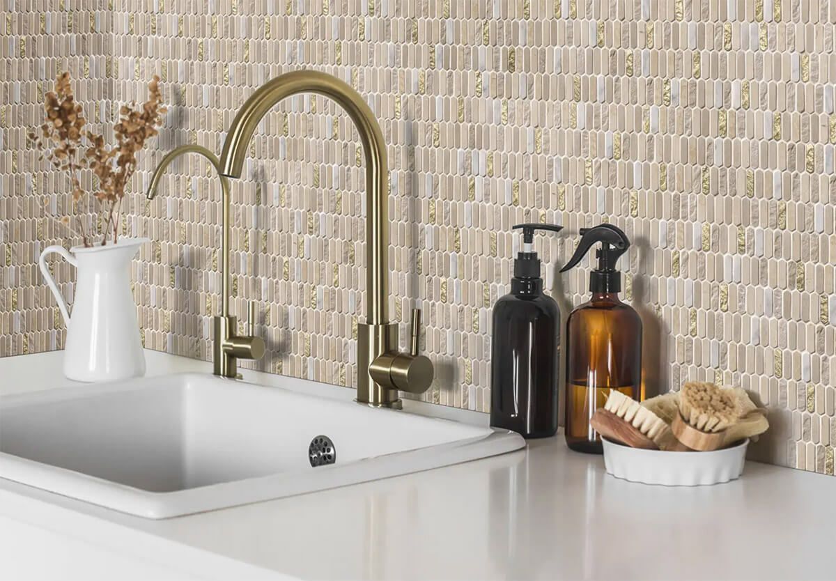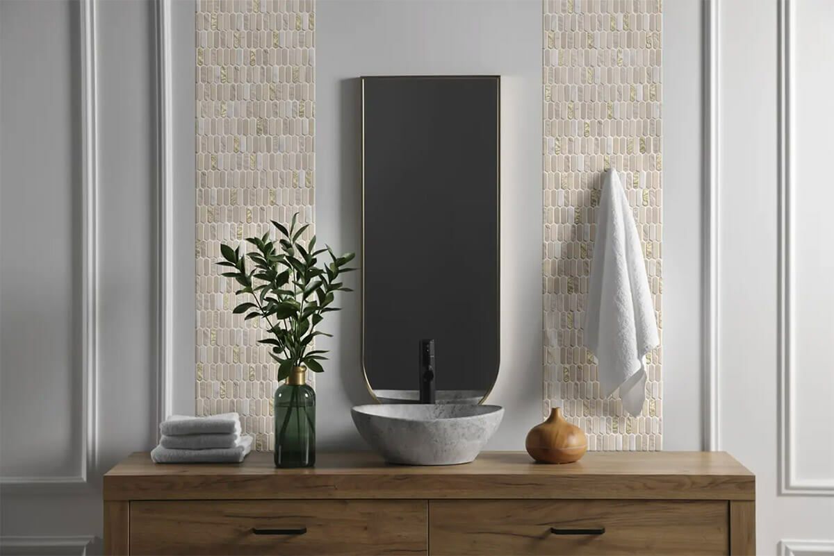 長細い六角形が特徴。宝石のような輝きを持つ樹脂と、天然の石材を組み合わせた品のある表情豊かなモザイクタイルです。