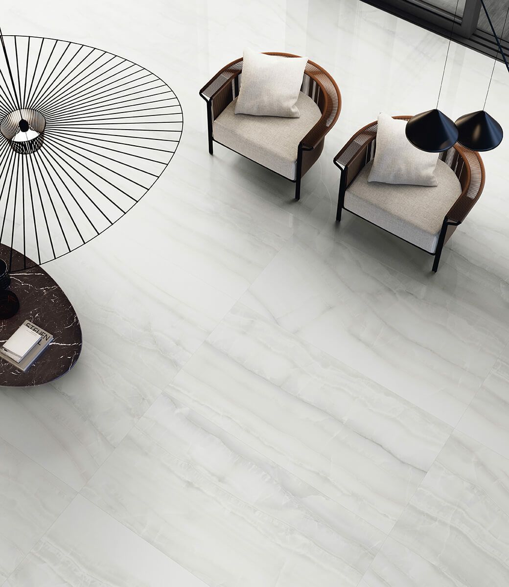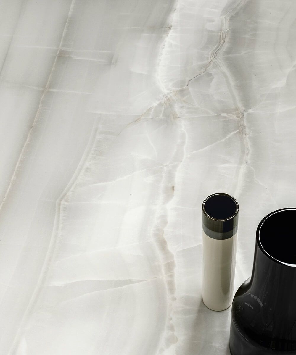 東洋の美しい海で育まれたアコヤ真珠からインスパイアされて作られたタイルです。高級なアラバスター鉱石やオニキスを連想させる特別な輝きがタイルに宿っています。特に明るい色調は、深い立体感が際立っており、これは繊細なニュアンスを巧みに取り入れ、デザインと石本来の模様を絶妙に組み合わせることで実現しました。また、結晶化処理によって形成された鉱物を均一に配置する独自のクリスタル仕上げにより、非常に高い透明度が生み出されています。