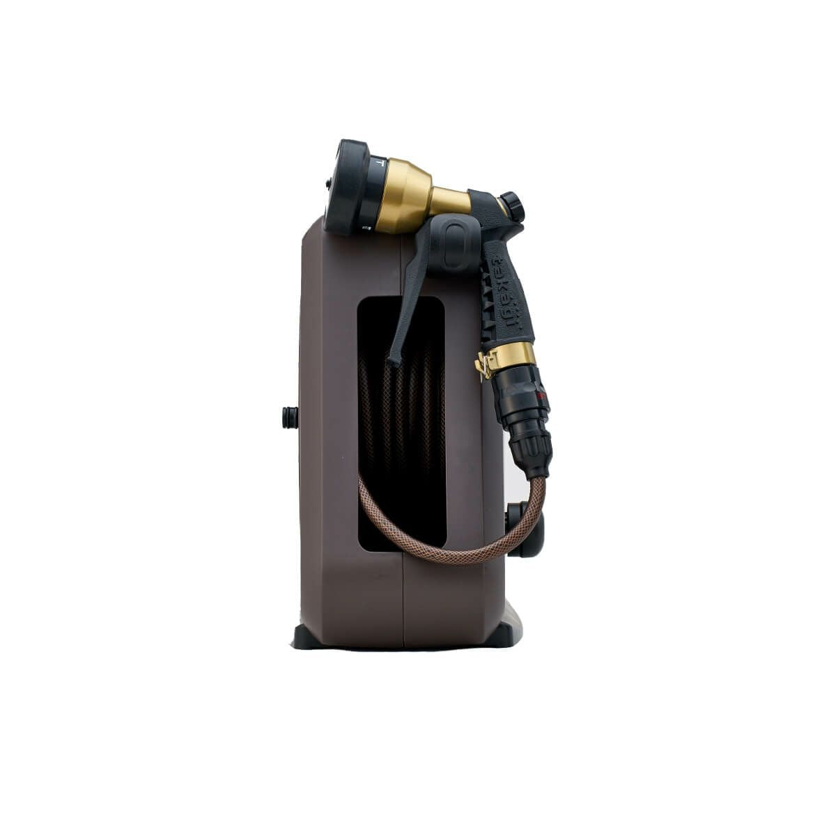 ホースが本体カバーに収納されるため、手を汚さずにホースをきれいに巻きとれ、 日差しによる劣化からホースを守ります。