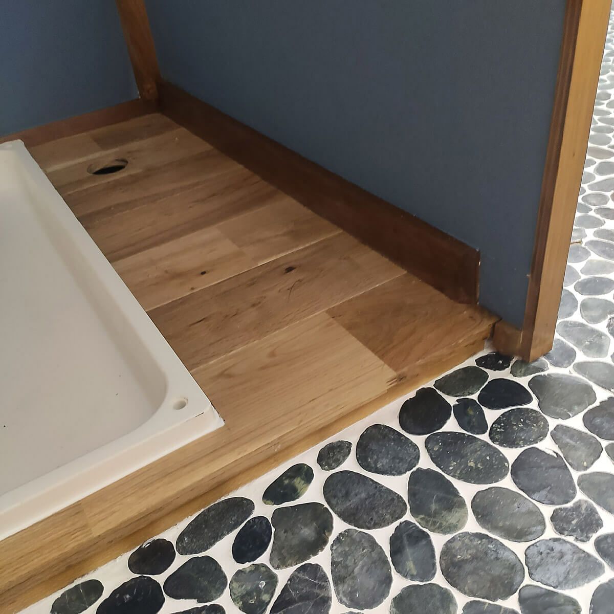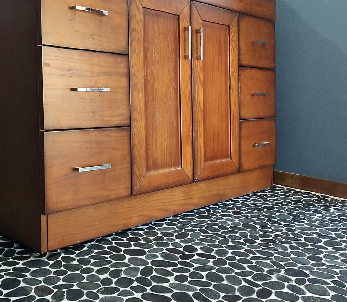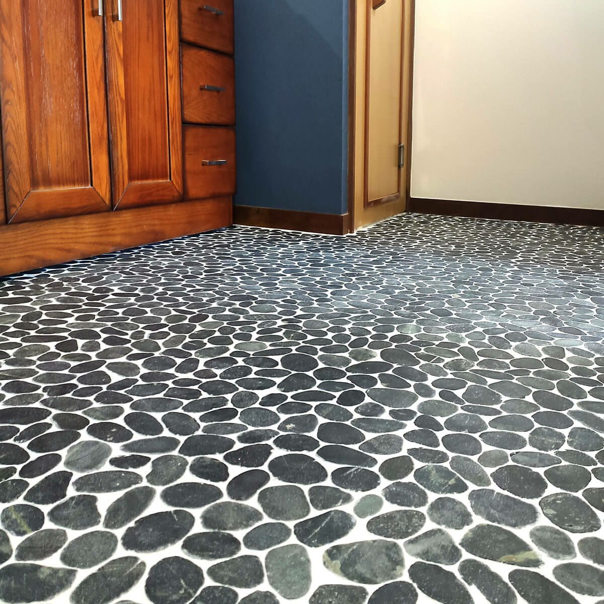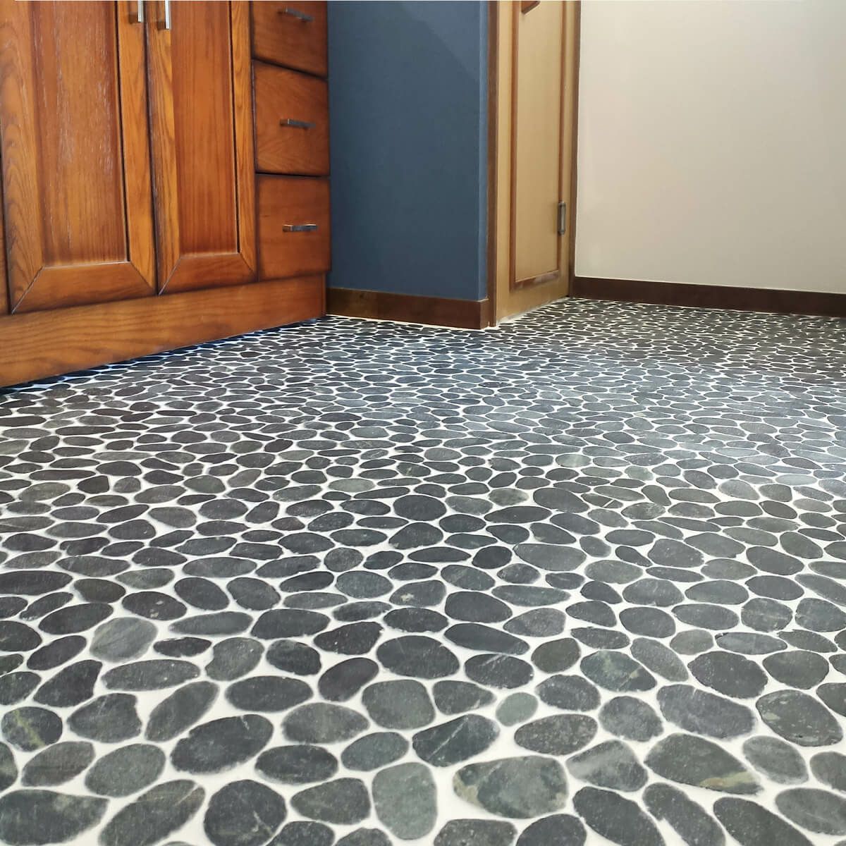These rectified pebble tiles are magnificent, I chose to grout them in white to make them stand out. My customer loved them -