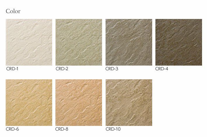 すべりにくさはそのままに汚れを落としやすくした床タイル。「マイクロガードフロア」仕様の床タイル・クレド。スレートの質感を持ち、床タイル定番形状をそろえたパターン張りも可能なお値打ち感のある床タイルです。