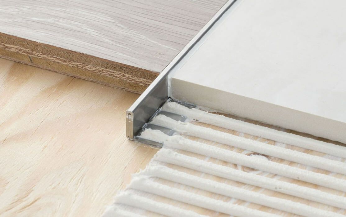 - タイルとフローリングの間に床見切りLを設置する場合は、フローリングとの間に隙間ができないように設置して、タイルとの間はシーリングで調整してください。