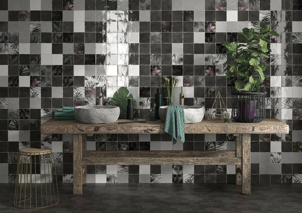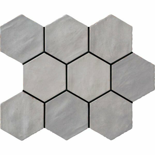 モロッコの伝統的なゼリージュ・タイルをモチーフに、流行のボタニカル柄と六角形を加えて現代的な使い方をしています。