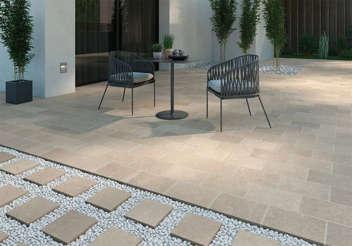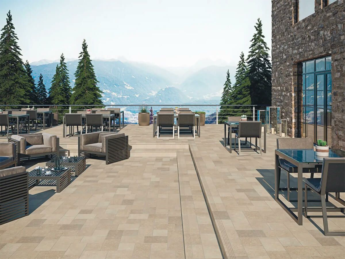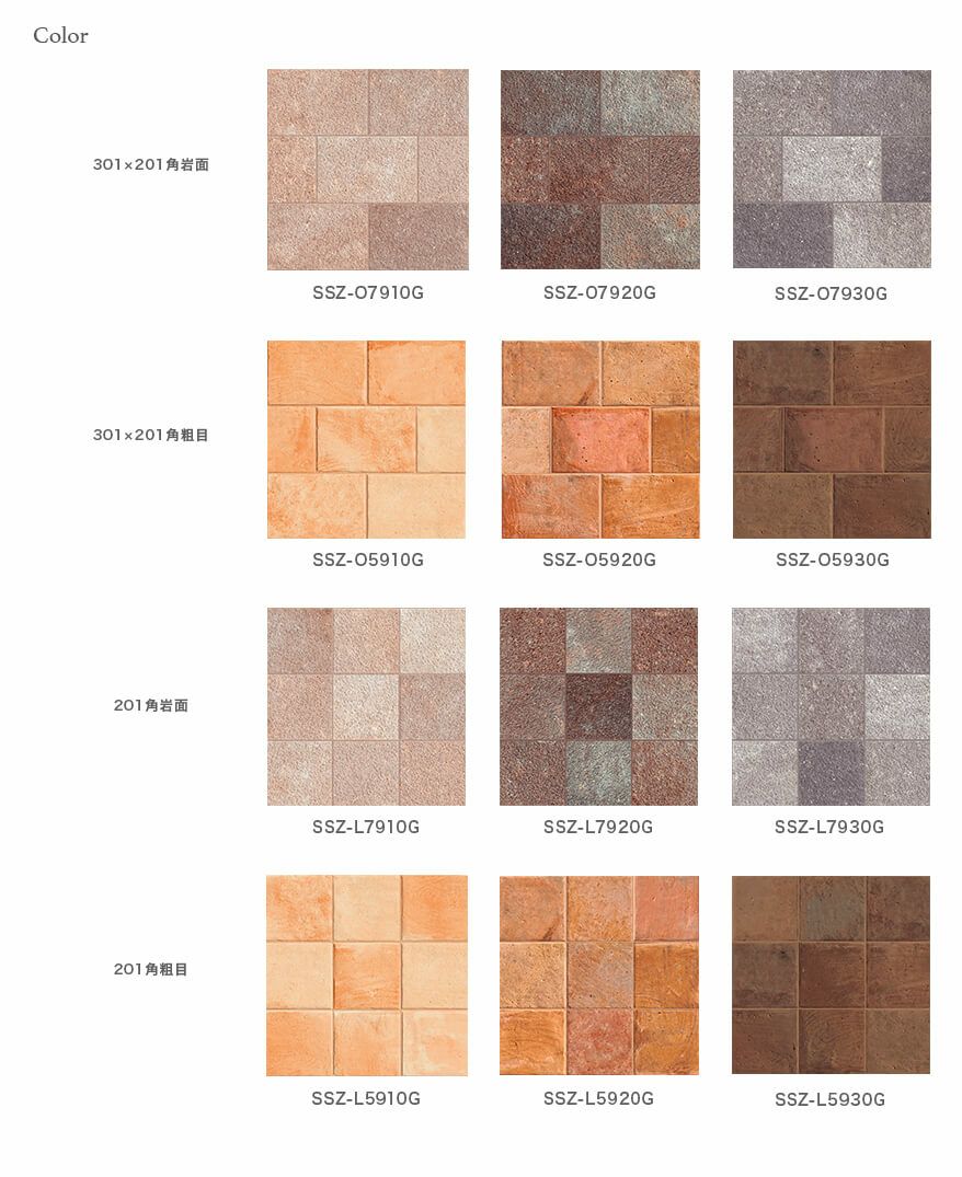 住宅の外構や駐車場などの小さな面積に取り入れやすい、スモールサイズの20mm厚タイルです。自然や田舎の風景に似合うテラコッタの素焼き風をイメージした3色と、都市部の歩道で見かけるポルフィード(斑岩)をイメージした3色の、合計6色の2形状をラインナップしました。