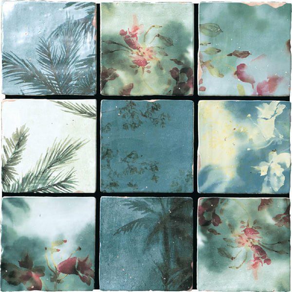 モロッコの伝統的なゼリージュ・タイルをモチーフに、流行のボタニカル柄と六角形を加えて現代的な使い方をしています。