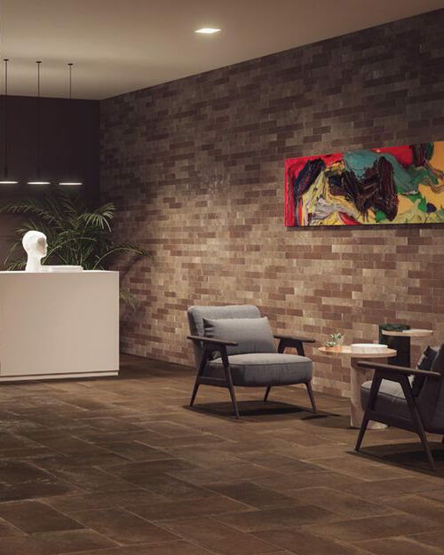 中世の街並みに使われたレンガの風景を再現。磁器質の確かな性能と経年による柔らかい風合いという相反する特長をうまく融合しています。