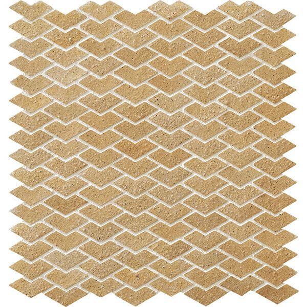 レンガイメージでさまざまな形状を揃えたモザイクタイル。ラフな面状に残った目地材が、より自然な雰囲気を演出します。