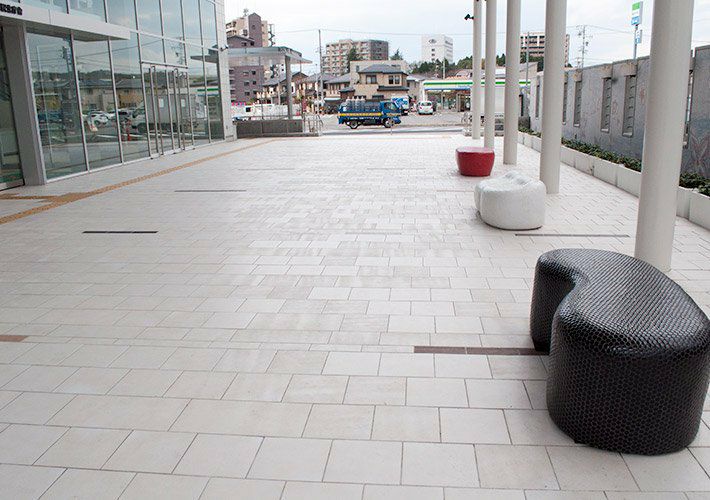 さり気ない石目模様でシンプルにデザインし、あえてサイズを変えているタイル。