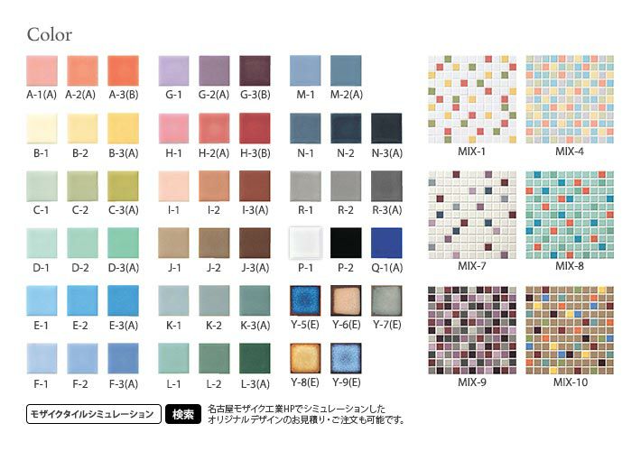 - 名古屋モザイク工業「モザイクタイルシミュレーション」対応商品です。ミックス・デザイン貼り等にも対応しますのでご相談ください。