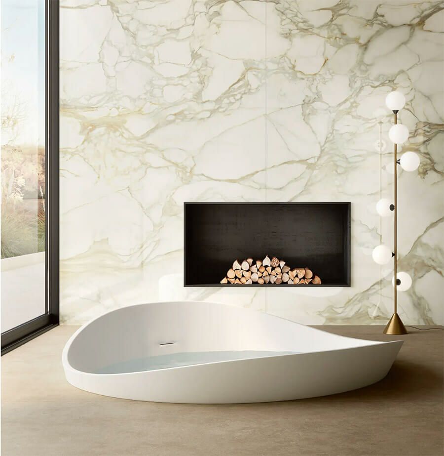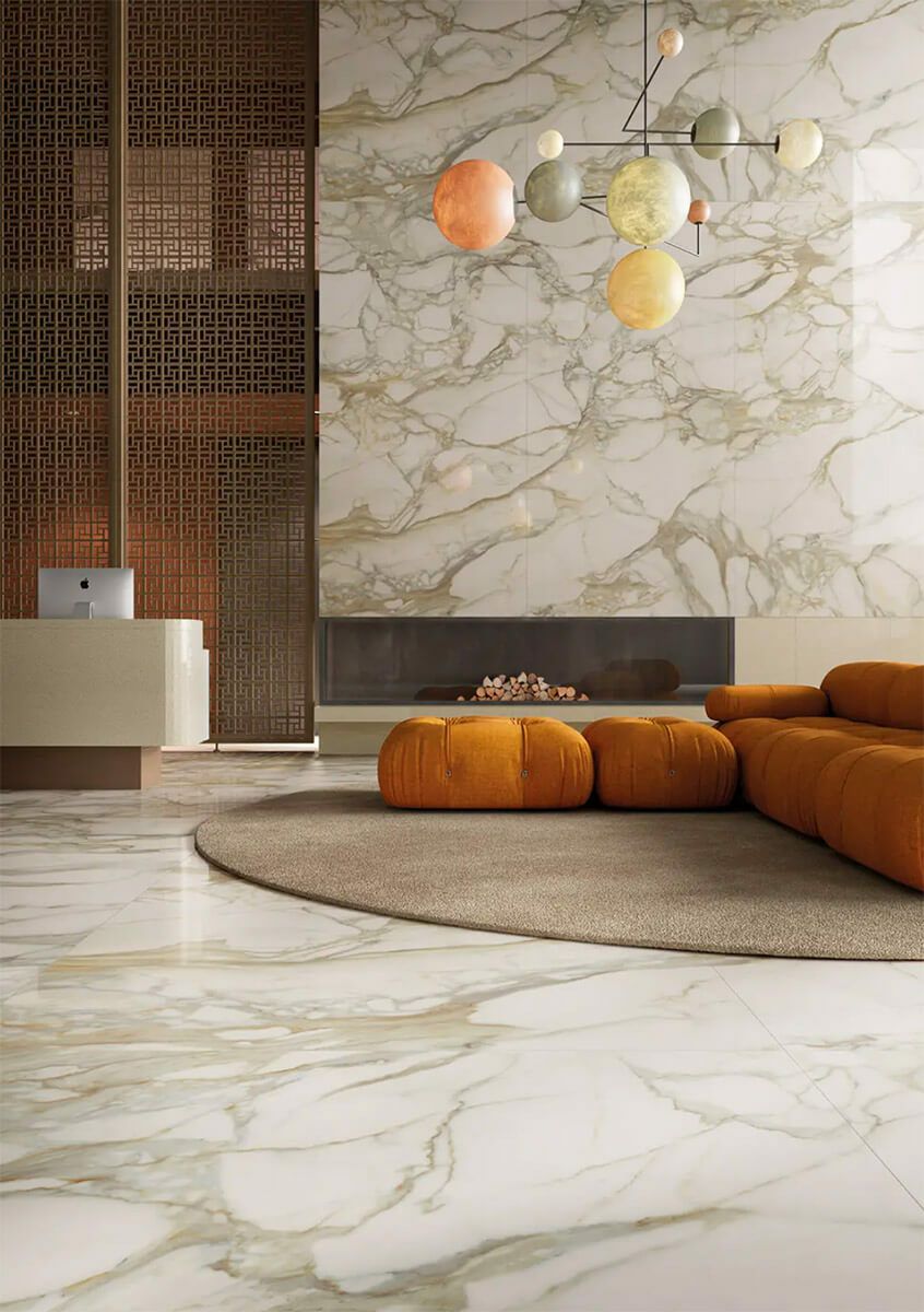 大理石調タイルの最高峰シリーズ、マルミマキシマム。 複雑な石模様や透明感を表現するため、原料となるパウダー状の粘土を複数色配合。 さらに釉薬を素地の中まで浸透させた状態で高温焼成し、本物のような美しさと、本物以上の物性を兼ね備えた製品を実現しました。