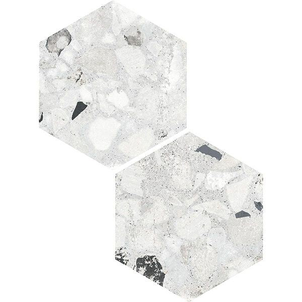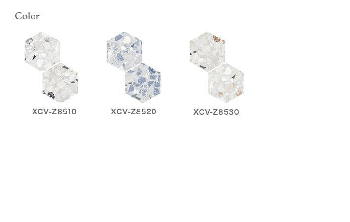 大理石のチップをモルタルに埋め込んだ滑らかな仕上がりのテラゾータイルを耐久性のある磁器質タイルで再現したこのシリーズは、鮮やかなカラーを採り入れ、六角形の形状で現代的にアレンジしたマテリアルです。 過去と未来が交差するドラマチックなデザインは、テラゾータイルの再解釈という斬新なコンセプトから生み出されました。
