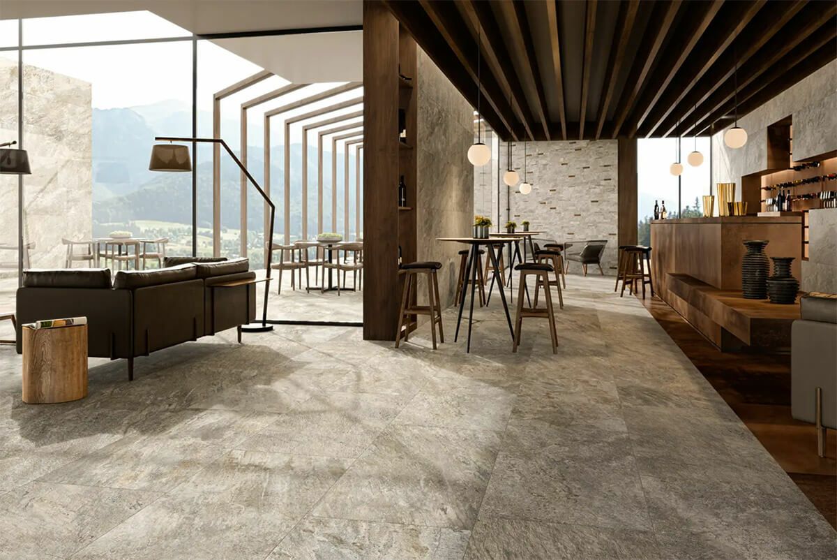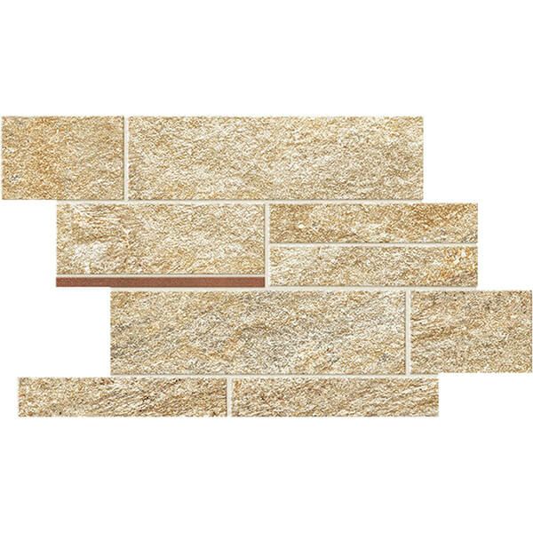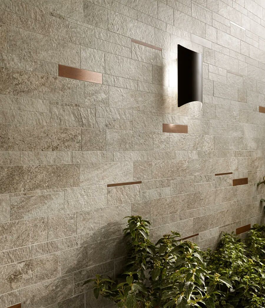 重厚なクオーツサイト(珪石)をモチーフに、表情豊かな凹凸を再現するマテリアルです。 新しいトレンドのベージュ色と、コールテン鋼のメタル要素をプラスした独創的なデザインのボーダーアイテムは、石材のクールな印象とは一味違うイメージを創造します。