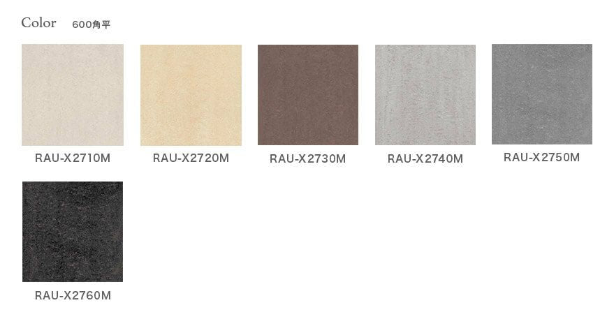 シンプルな600角で、使いやすい6種の基本色と3面状を揃えています。框用として、1200×300角20mm厚(受注輸入品)もラインナップ。